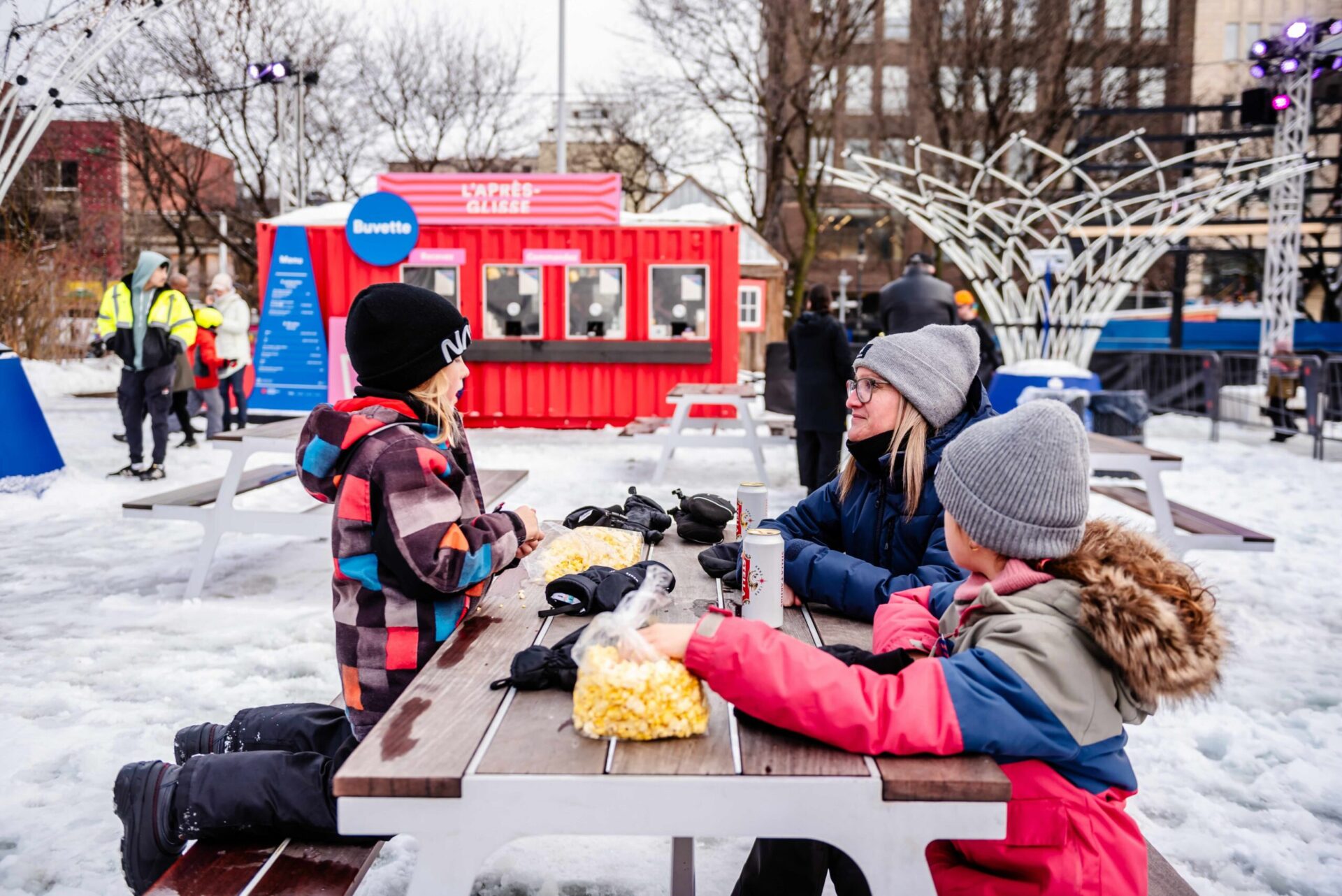 Création d’un environnement accueillant avec l’aménagement d’espaces de détente et de socialisation extérieurs adaptés au froid, avec “l’Après-Glisse”. Permettant d’offrir des collations, des plats réconfortants et des boissons chaudes et avec l’organisation de Djs sets en soirée pour réchauffer la piste de danse.